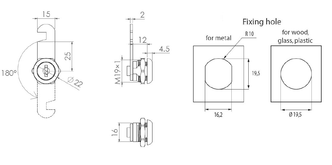 Cam Lock 1912, 180DG, Cam A09 Hooked, Right, CPL,CK SISO,Cam Mounted 12 O´clock when Open, W/Hook Opening on Left Side, For Right Hand Doors, Cam Plate Riveted onto the Lock, Max 6mm Panel Thickness