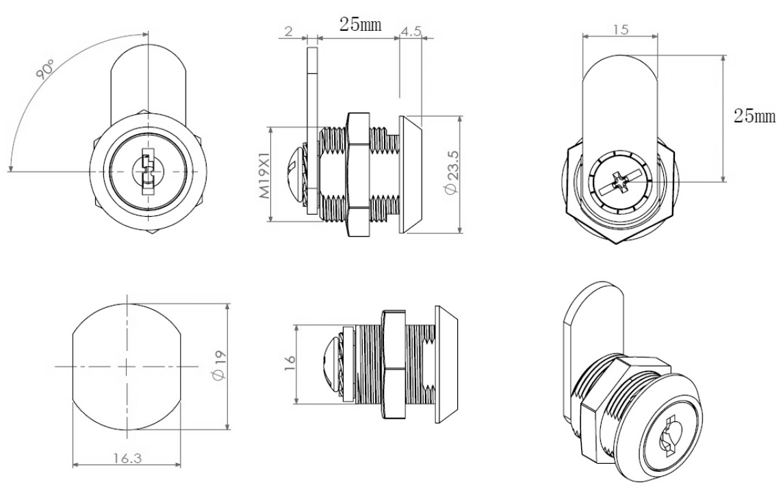 Cam Lock M1925S, 90DG, Cam No. A01,Black,Snake MK SISO,#01 With Full Thread, Master Key System #01