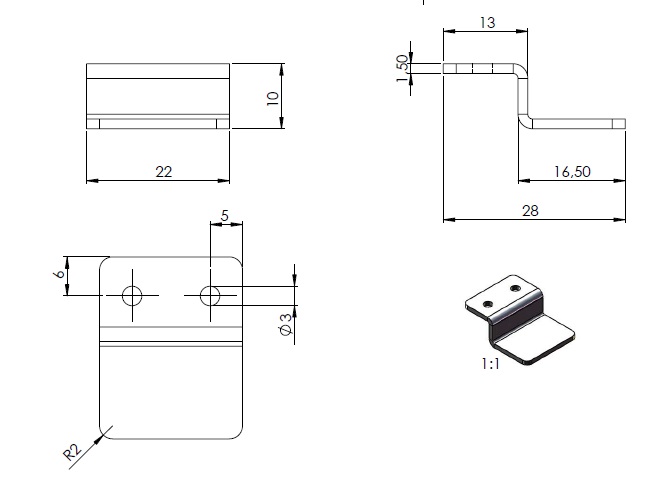 S-Shaped Striker, NPL, 22x28x1,5mm, 10mm Crank, W/2 ø3mm Screw Holes