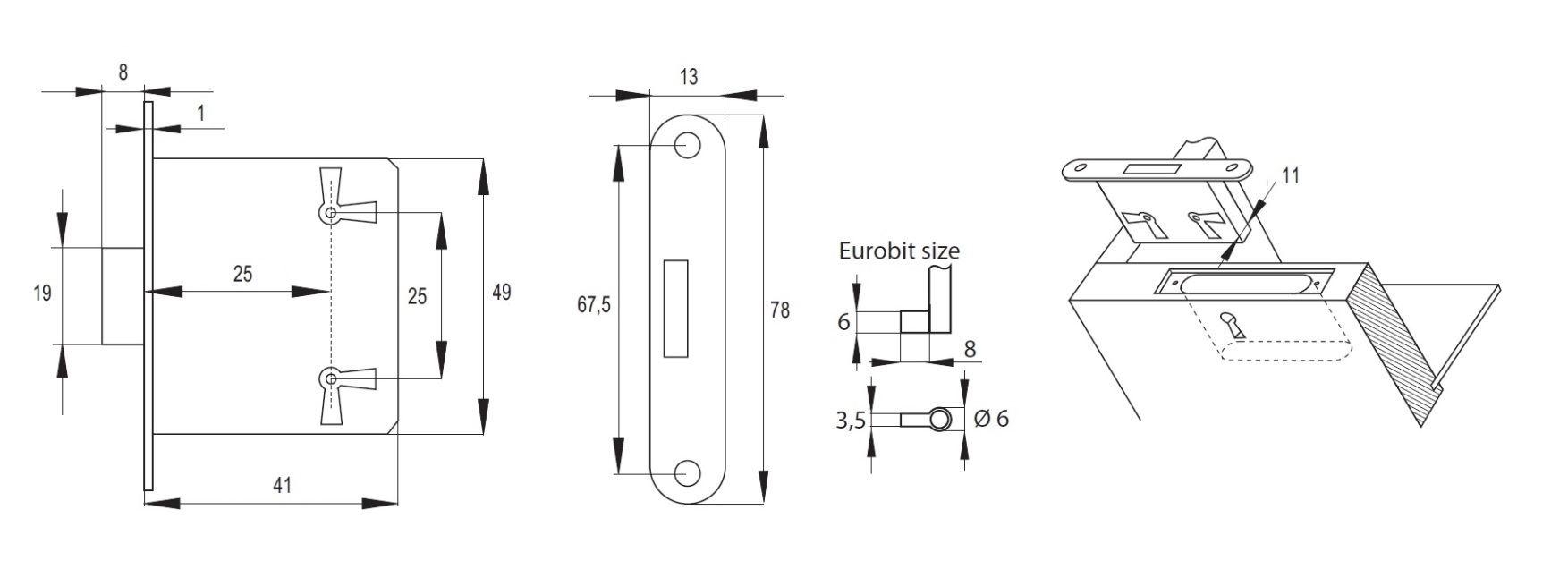 Mortise Lock, 25mm Backset, L/D/R, No Key, Oval Brass Front Plate, Steel Body, Simple Euro-bit Closing