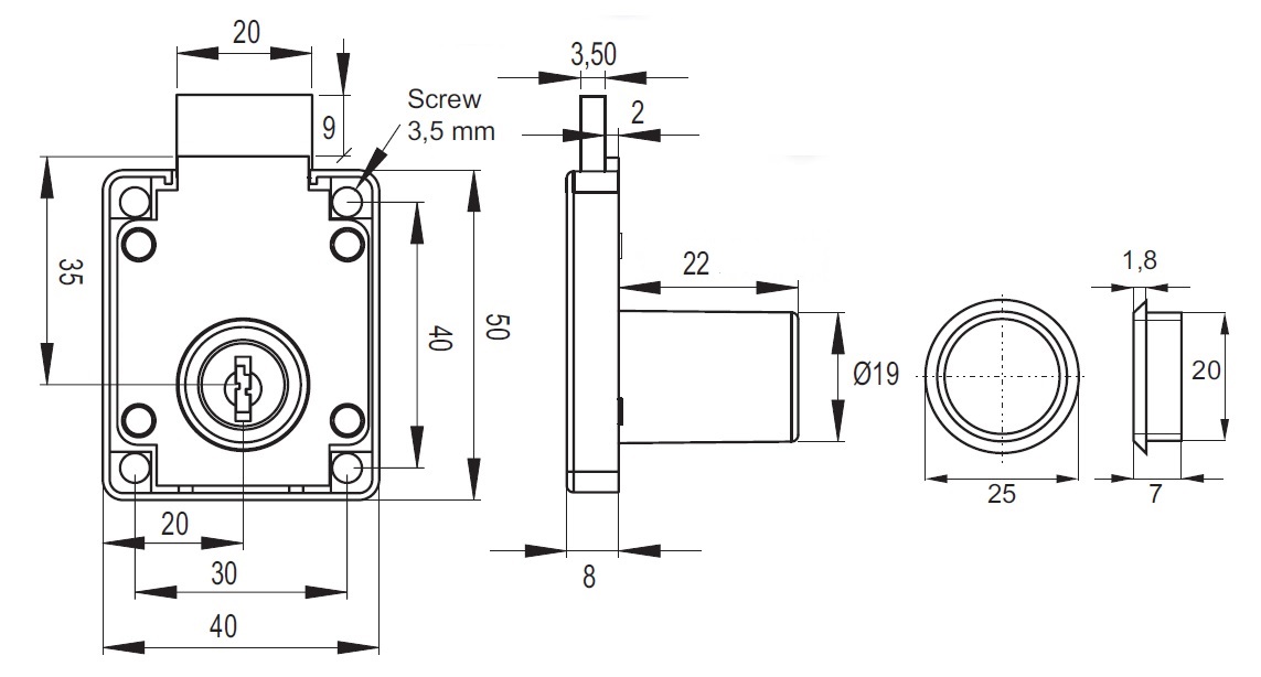 Rim Lock MIC950 Backset 35mm, ø19x22mm, HCK SISO, LH, #J12 Nickel Plated