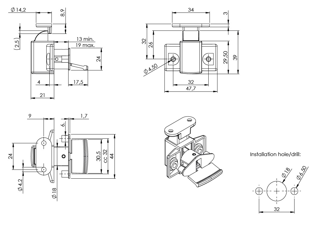 Slam Lock "RV", W/Lift Handle Mini,13-19mm,CPL Zamak Handle & Grey ABS Housing, Incl. Grey ABS Striking Plate