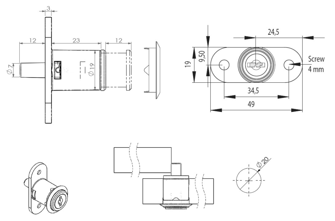 Push Button Lock MIC-1003, ø19x23mm, NPL, HCK SISO, #J11.W/ Key Code Stamped On Key & Cylinder Front
