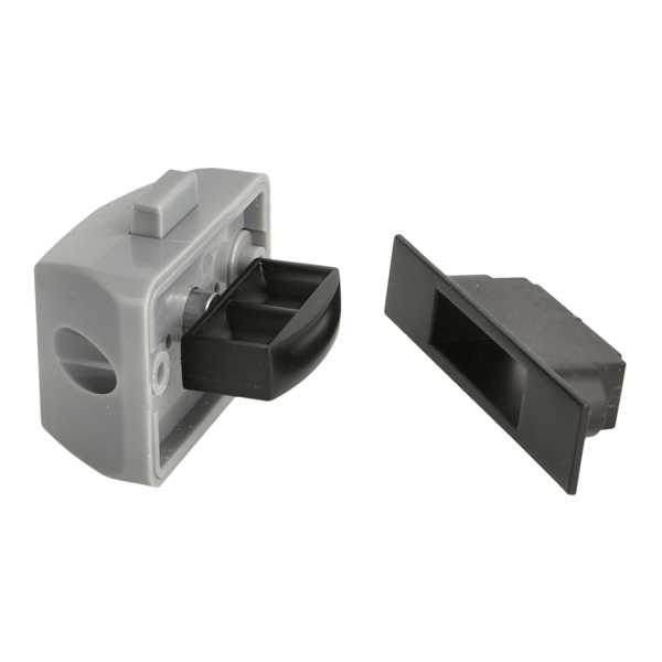 Push Lock "RV", F/12-16 mm, BLK, "Recta" Zamak Knob & Grey ABS Housing, Incl. Grey ABS Striker W/Spring Tension & 3mm Panel Reduction Spacer in Grey ABS