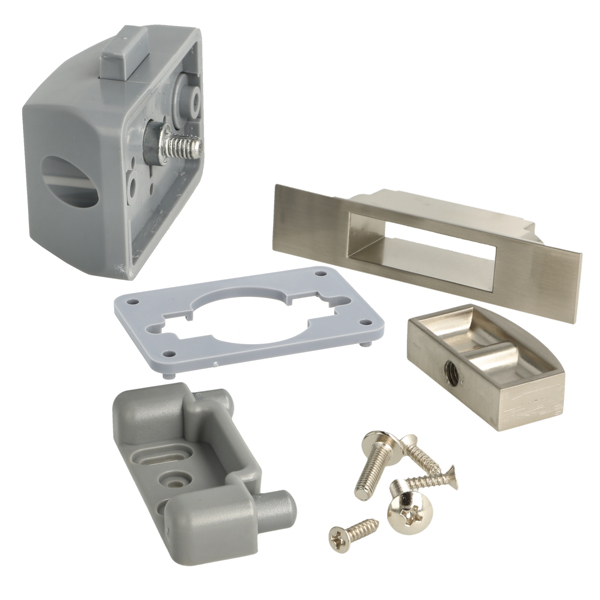 Push Lock "RV", F/12-16 mm,SS-Look,"Recta" Zamak Knob & Grey ABS Housing, Incl. Grey ABS Striker W/Spring Tension & 3mm Panel Reduction Spacer in Grey ABS